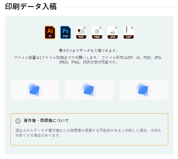ご注文時の入稿はカート内の「印刷データ入稿」よりデザインデータを添付ください。